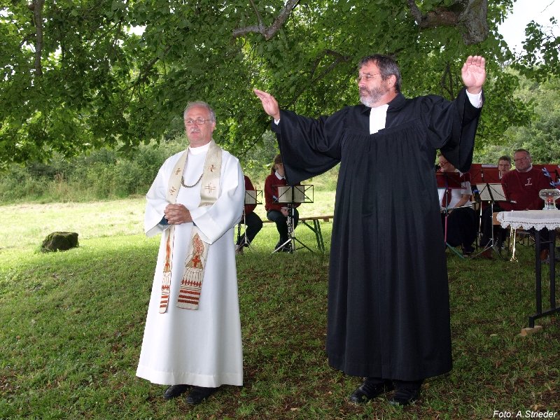 Der Beilsteiner Posaunenchor eröffnete den Gottesdienst mit dem Lied „Geh aus mein Herz und suche Freud". Pfarrer Walter Henkes stellte das Problem „Grenze" in den Mittelpunkt seiner Predigt. An der historischen Stätte am „Dicke Baam" habe eine Kirche gestanden, die für alle da war. Erst später seien die Kirchen in die Dörfer geholt worden, und bald darauf die Grenzen entstanden.