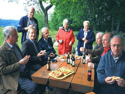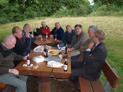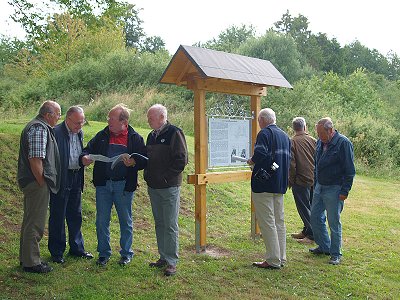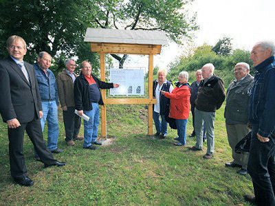 Neue Informationstafel an der Heilig-Kreuz-Kirchegeoelektrische Messung bestätigt den Standort einer KircheTrotz des unruhigen Umfeldes, das durch frühere Störungen verursacht wurde, wurden bestimmte Bereiche als Reste massiver Baustrukturen entdeckt. Sie können aufgrund ihrer Ausrichtungen und in Anbetracht des Geländebefundes sowie der bekannten Geschichte des Ortes als Mauerreste oder Fundamente der Heilig-Kreuz-Kirche interpretiert werden. Nach den Messergebnissen sind noch Teile des Ostchores, die nördliche Längsseite sowie die Westseite erhalten. Für die Nord- und Südwand konnten keine gesicherten Ergebnisse ermittelt werden. Bei der Übertragung der Messwerte in ein Kataster wurde erkennbar, dass die Grenze zwischen den Gemarkungen Arborn und Mengerskirchen sowie die Grenze zwischen dem Lahn-Dillkreis und dem Landkreis Limburg-Weilburg mitten durch den Baukörper verläuft. Die Ergebnisse der Untersuchungen wurden jetzt auf einer Informationstafel der Öffentlichkeit zugänglich gemacht. Neben dem „Dicke Baam" hat der Arbeitskreis „Heilig-Kreuz-Kirche" der drei Vereine die schmucke Tafel aufgestellt. Gezimmert wurde sie von Herbert Eckerth, Willi Halle schmiedete das Eisengestell, die Dachdeckerarbeit verrichtete Alfred Schäfer. Die Unkosten wurden aus den Spenden der jährlich am „Dicke Baam" stattfindenden ökumenischen Gottesdienste beglichen. Roland Krumm, Vorsitzender des Arborner Heimatvereins, dankte den Erbauern der Tafel für ihre fachkundige Arbeit und stellte bei der Einweihungsfeier die Ergebnisse der durchgeführten Untersuchung vor. Die Feier klang mit einem gemütlichen Beisammensein mit einem Imbiss am „Dicke Baam" aus. -ast- Juli 2009