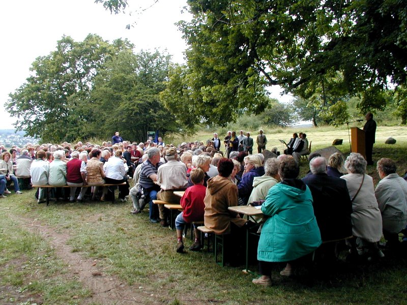 An historischer Stätte - am Galgenkopf zwischen Mengerskirchen und Arborn - feierten fast 200 Gläubige aus den beiden Orten einen ökumenischen Gottesdienst. Den Anlass dazu gaben der rührige Arborner Heimatverein und die Mengerskirchener Turmmuseums- und Wandervereine, deren Mitglieder in vielen Arbeitsstunden den Platz der ehemaligen "Heilig-Kreuz-Kirche" von Hecken und Sträuchern gesäubert und eingeebnet hatten. Es war die Idee des Arborner Heimatvereins, den historischen Platz würdig zu gestalten. Vorsitzender Roland Krumm dankte den vielen Arborner Helfern und Willi Diehl den Mengerskirchener Helfern, die den Platz rund um den "Dicke Baam" fein herausputzten und den Grundriss der alten "Heilig-Kreuz-Kirche" mit dicken Steinen markierten. Der Dank der Vereinsvorsitzenden richtete sich auch an die Bürgermeister von Mengerskirchen und Greifenstein sowie an die Forstverwaltung, die die Wünsche der Vereine sehr wohlwollend und unterstützend behandelten. |