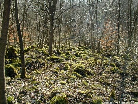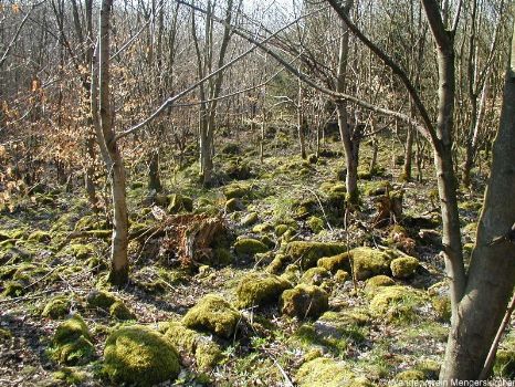 | Wallanlage "Rentmauer" auf dem Hansenberg ( 2,5 km östlich von Mengerskirchen ca. 4 ha, Höhenlage 453 m ü. NN) Die Wallanlage befindet sich auf dem Ende eines bewaldeten Bergsporns, der vom Knoten (595,4m) über den Galgenkopf (496,2m) bis zum Hansenberg (460,3m) nach SO vorspringt. Sie erhebt sich rund 150m über die beiden seitlich angrenzenden Täler, das Faulbachtal im SW und das Kallenbachtal im NO, und ist durch steil abfallende Hänge geschützt. Durch Verwitterung des anstehenden Basalts hat sich auf der Hochfläche ein vorwiegend mittel- bis flachgründiger, steiniger Boden gebildet, der auf dem Nordosthang in tiefgründigen, lehmigen Basaltboden übergeht.